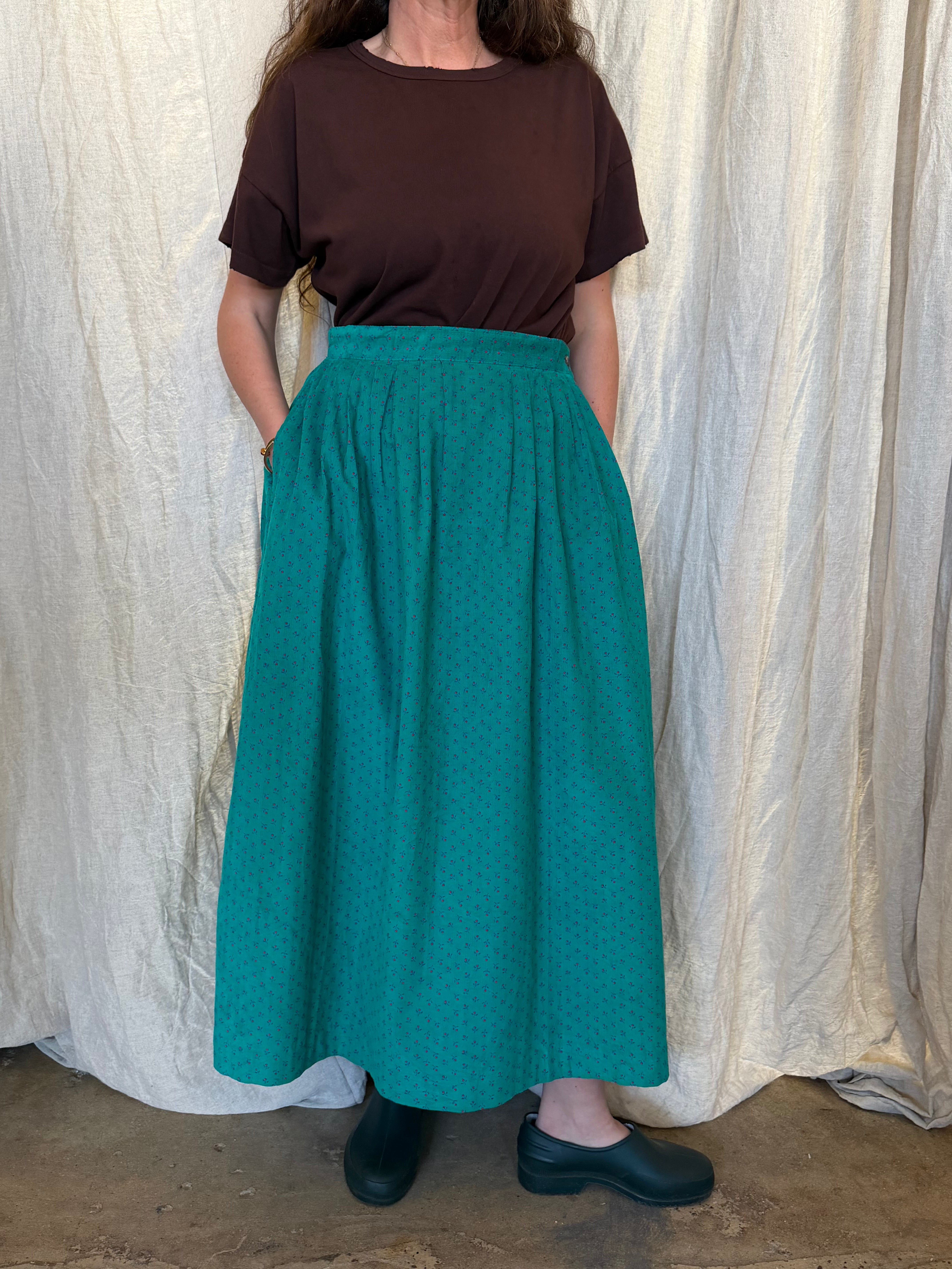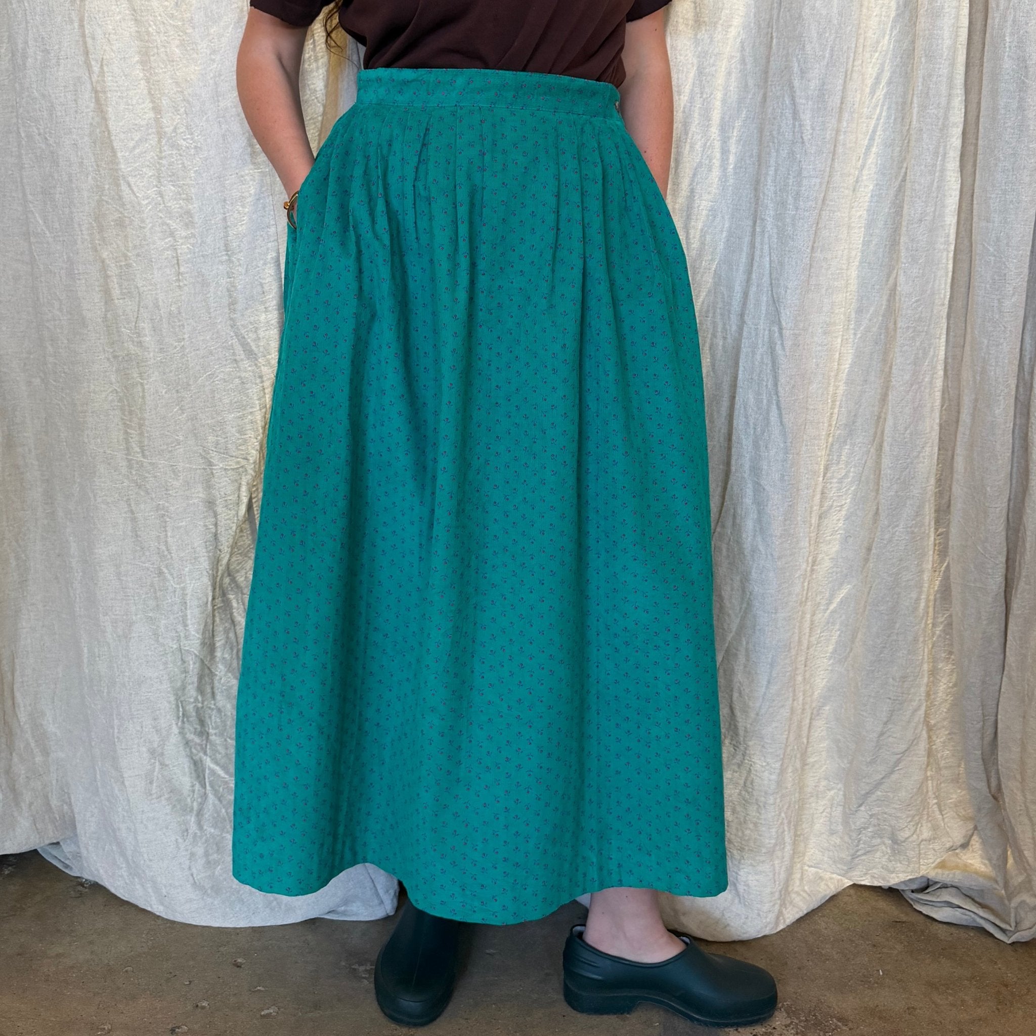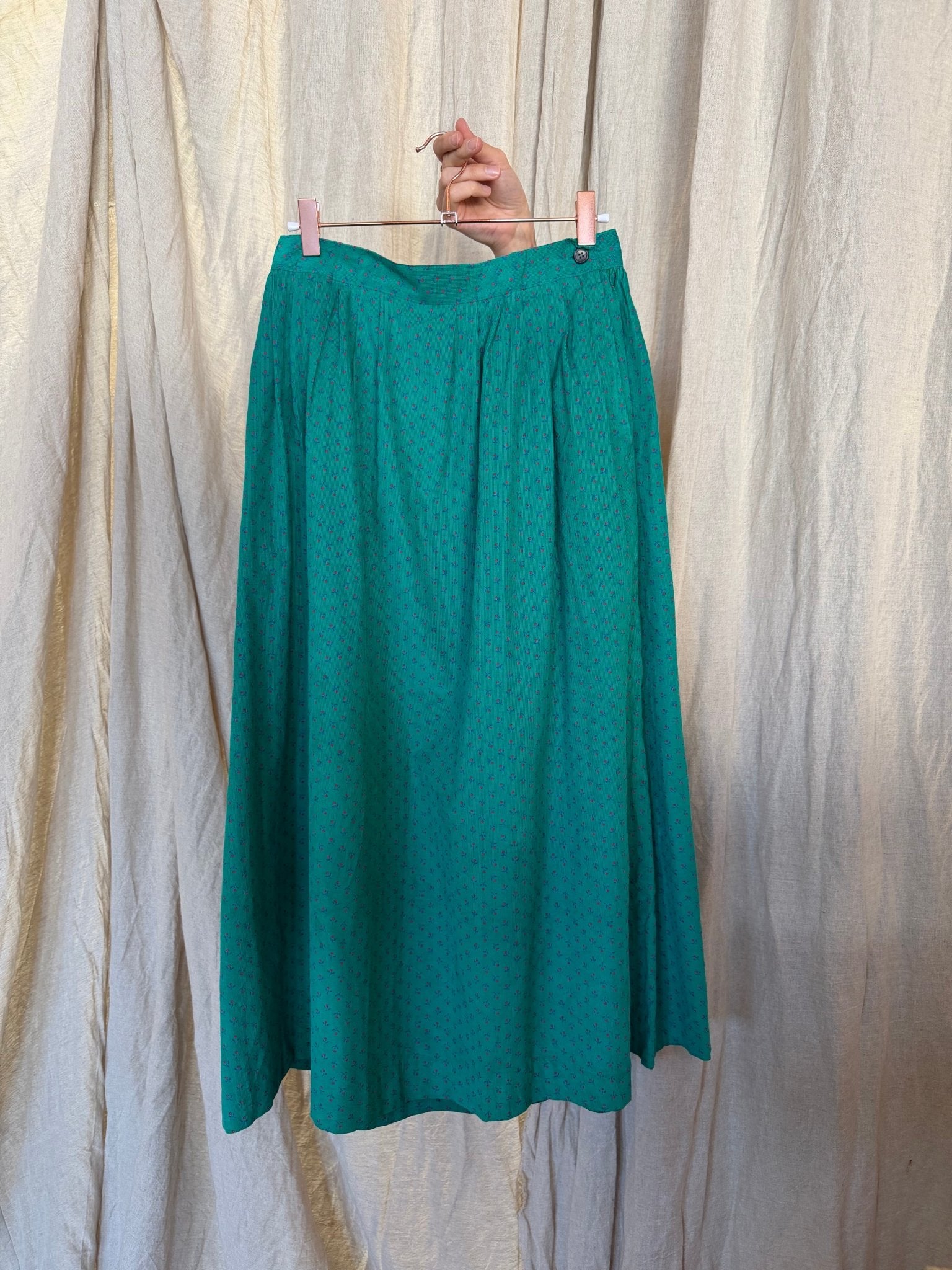 This darling vintage ditsy print moiré teal pleated corduroy waist skirt is pretty perfect! Pair it with a tee shirt or sweater, wearable in any season. Sourced in Paris!