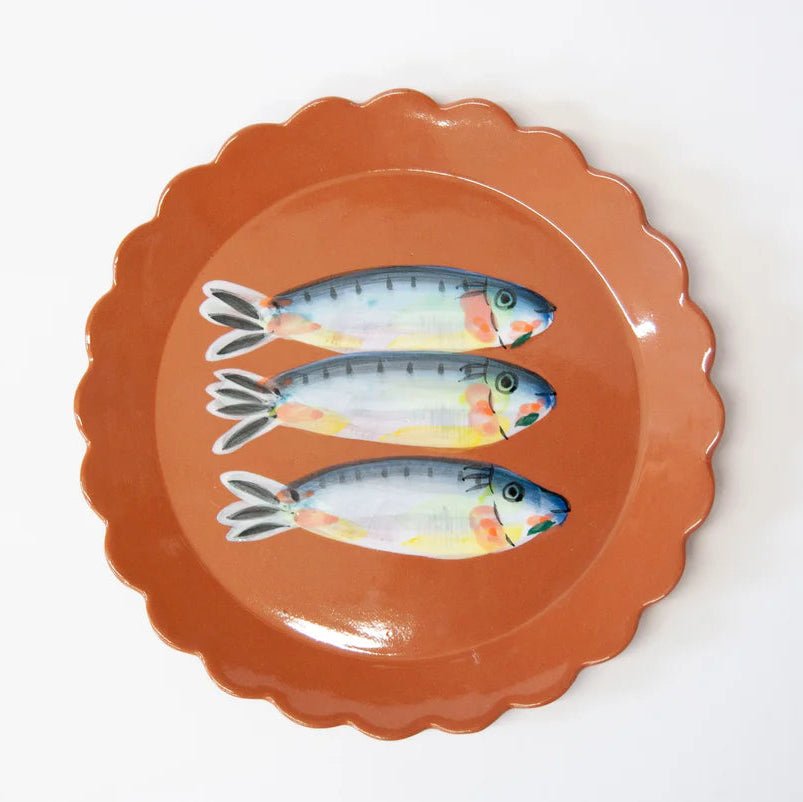 This delightful dessert plate boasts scalloped edges and a vibrant illustration of three colorful fishes, bringing a playful yet sophisticated touch to your table. Perfect for serving desserts or appetizers, its unique design adds a splash of personality to any meal setting.
