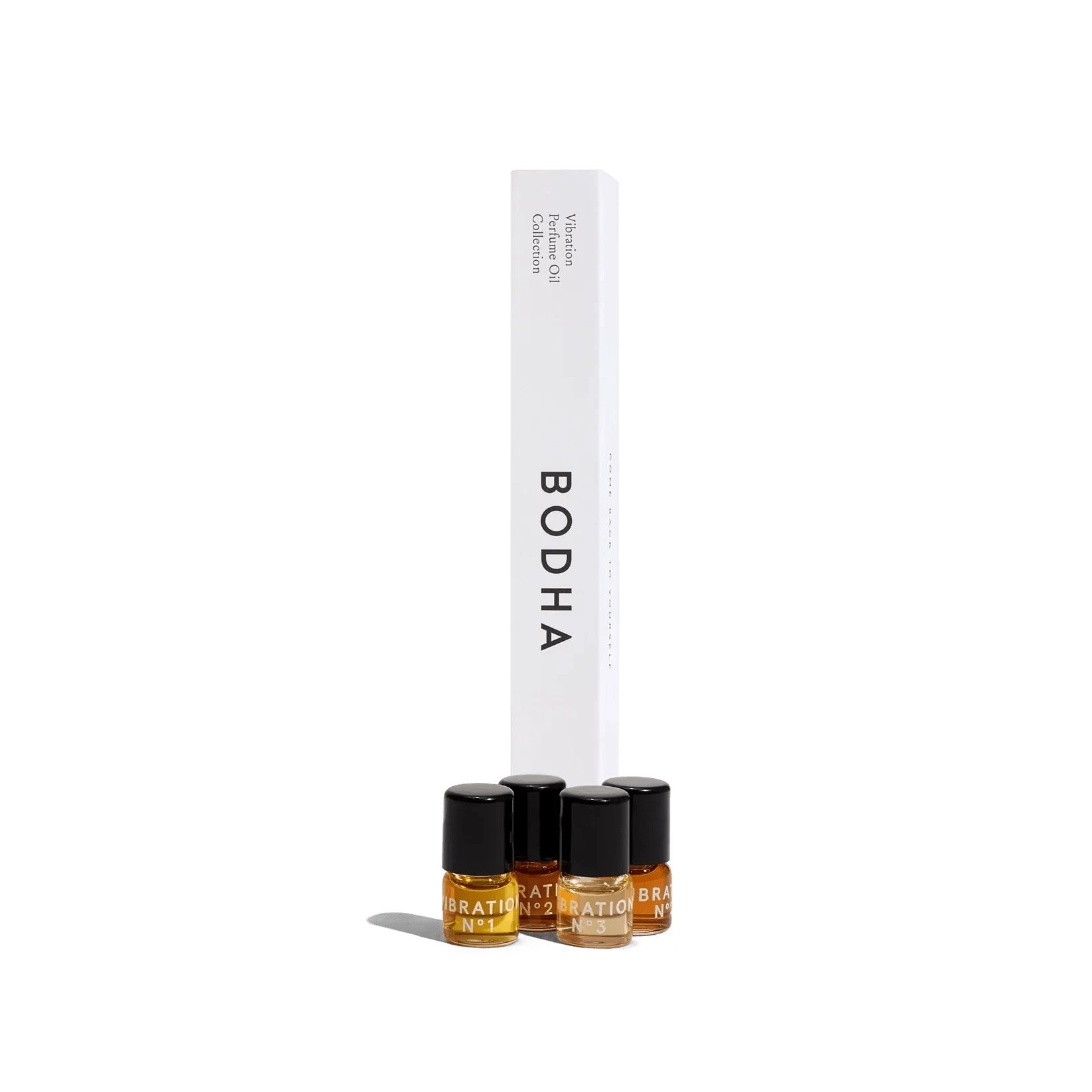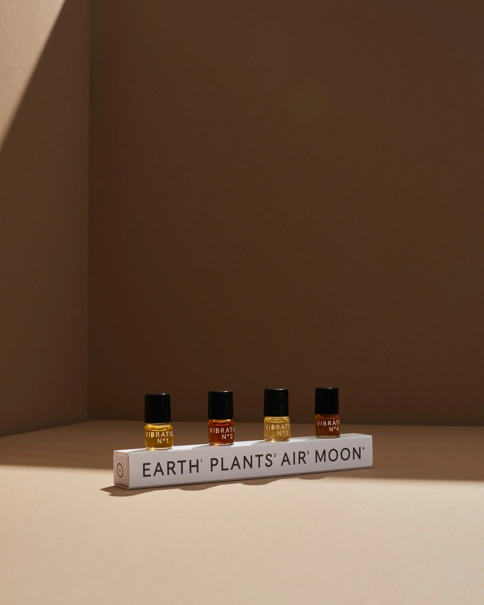 A mini roller of each Vibration Perfume Oil. Four scents for the feelings you want — anchoring woody Earth, energizing green Plants, expansive floral Air, and magnetic ambery Moon. Wear alone or layer to create your personal atmosphere.