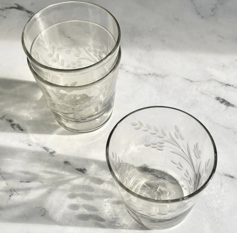 A functional and stackable tumbler. Handblown from recycled glass and hand-etched with a floral design, these lovely vessel will bring charm and character to the table.