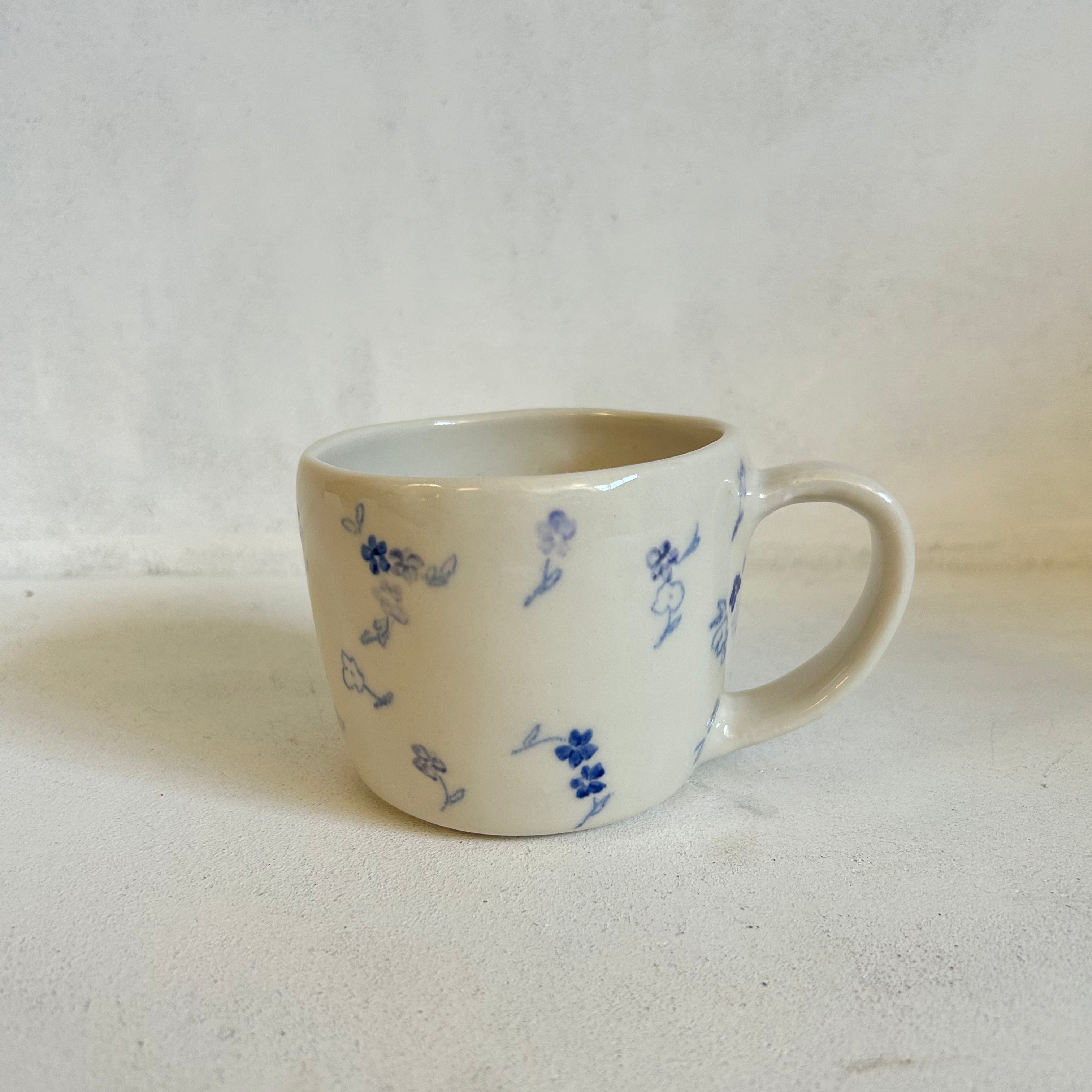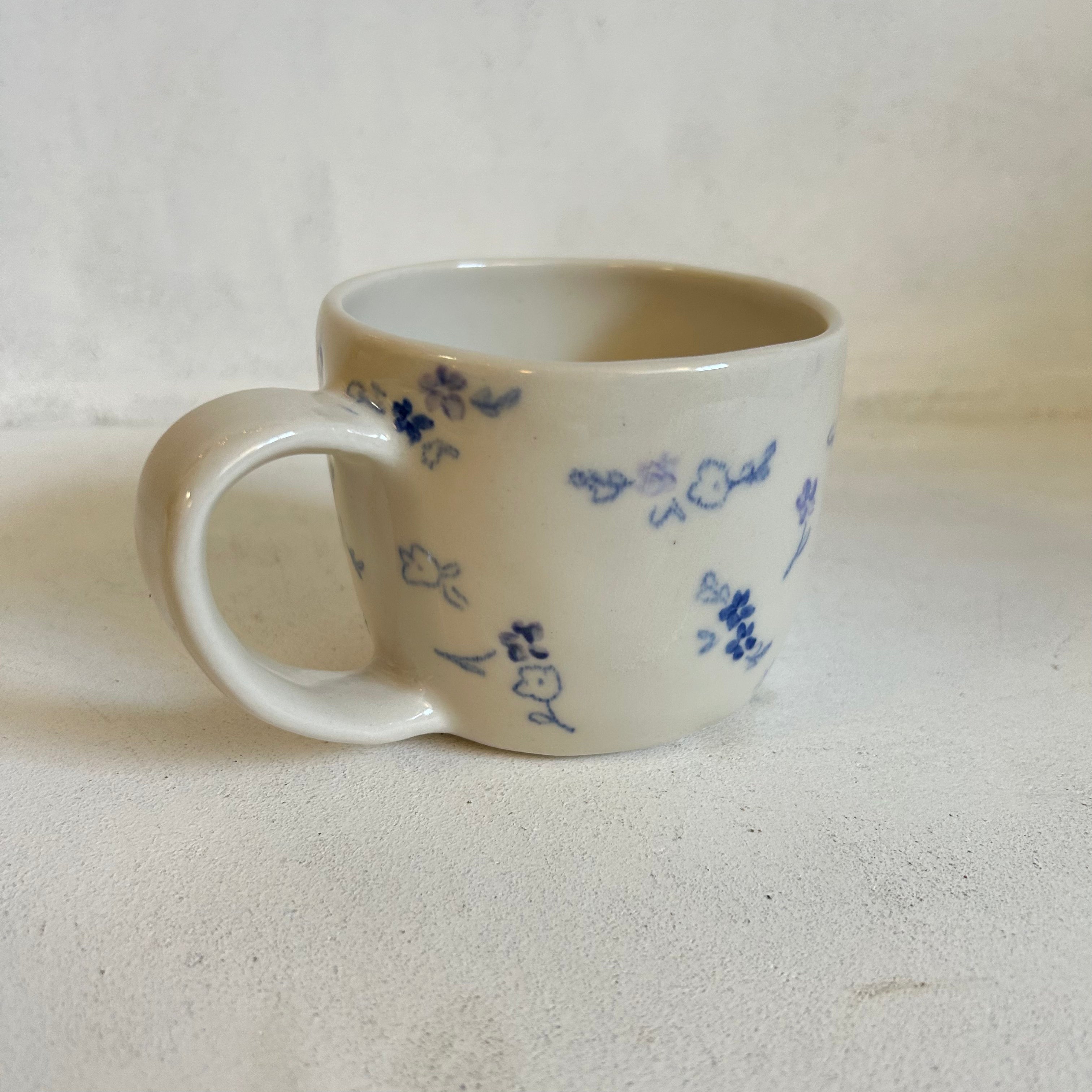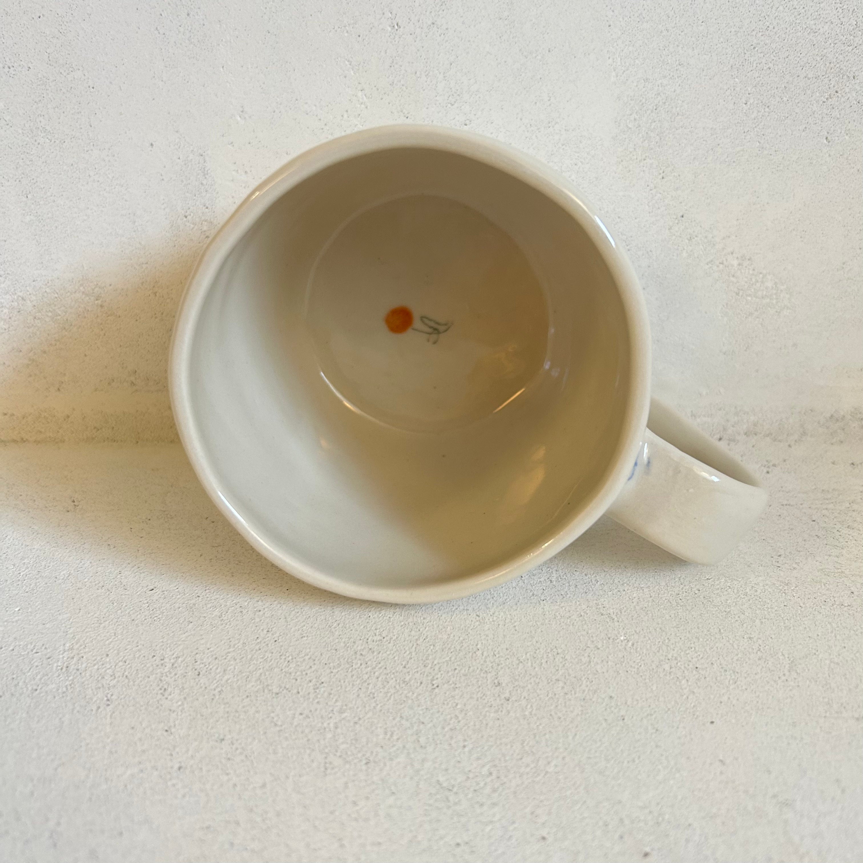 Ceramic mug made thoughtfully by hand with porcelain clay. This mug features a carefully placed daisy thumb rest on the top of the handle. Hand painted and glazed with food safe ceramic materials Porcelain, underglaze, glaze