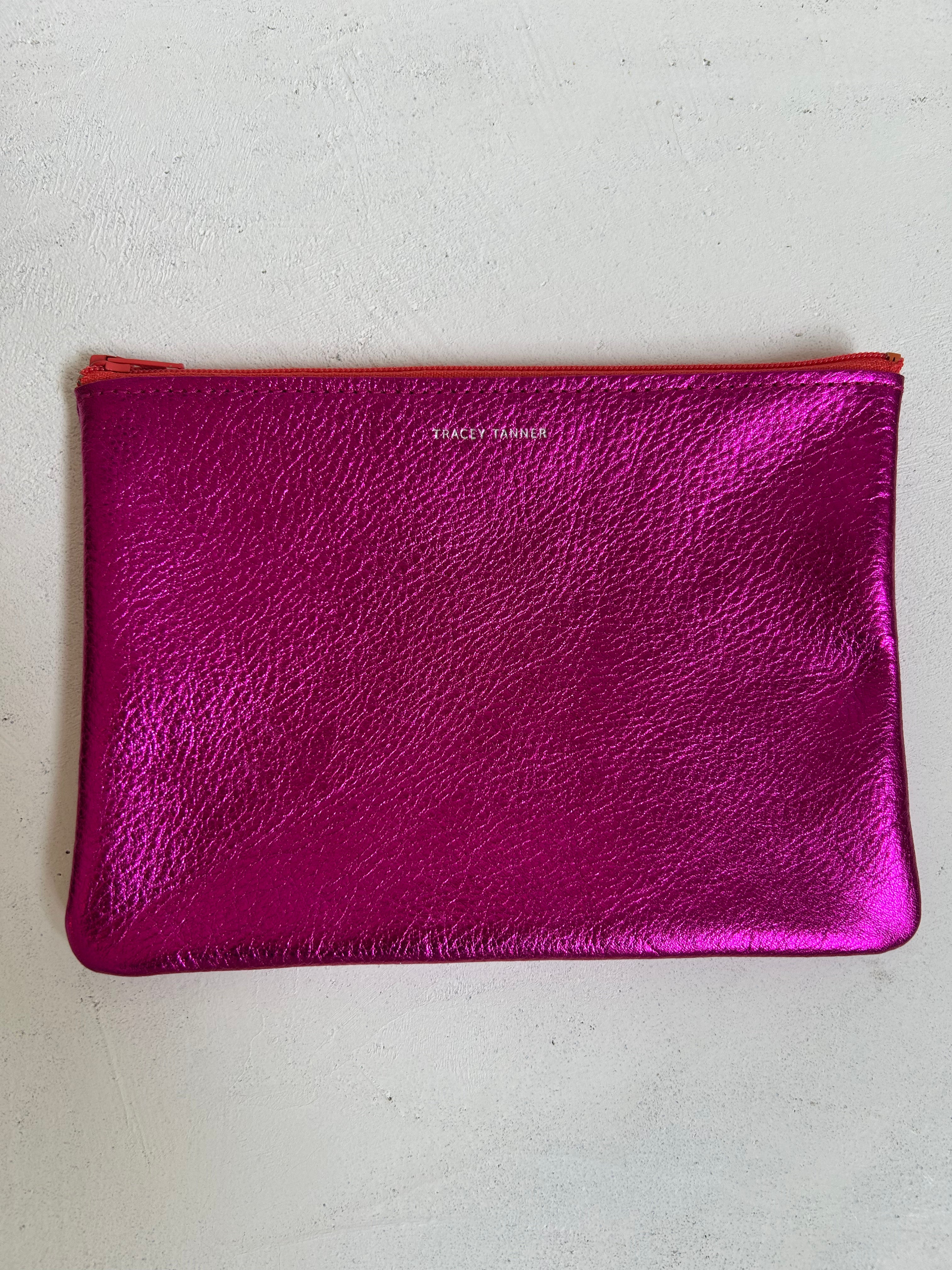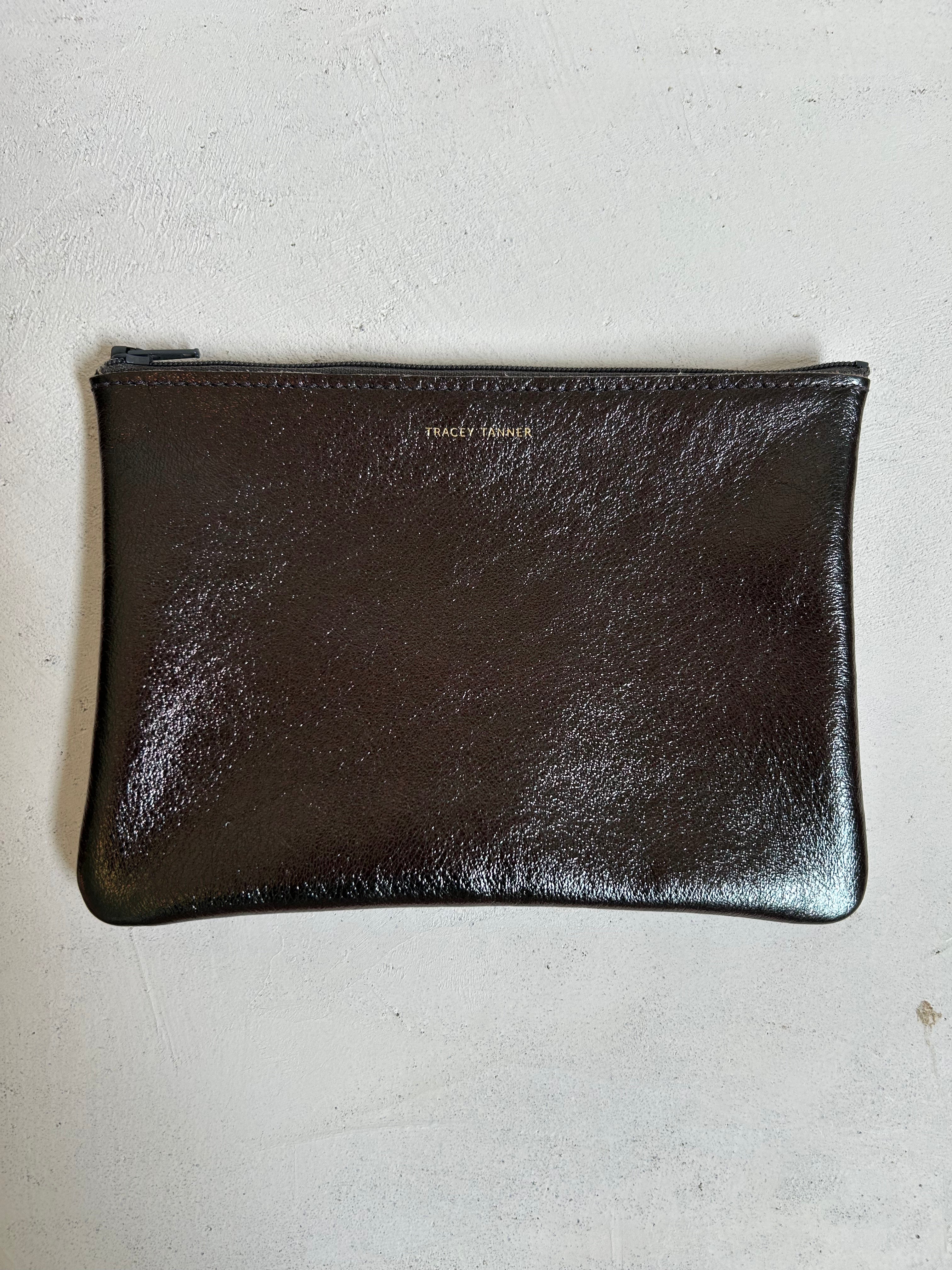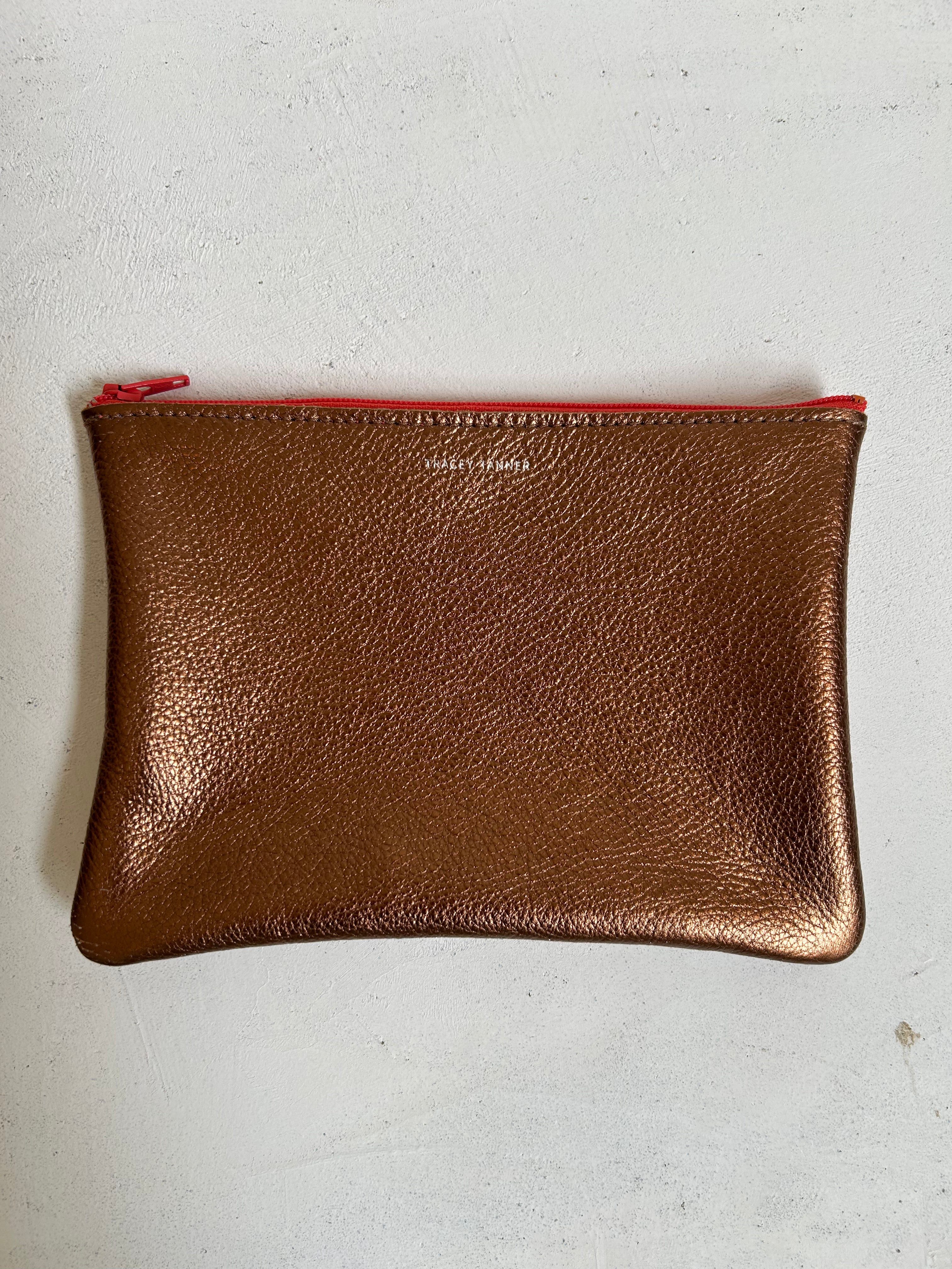 Leather flat zip-top pouch perfectly sized to carry your phone, cash, credit cards and/or cosmetics: Use it to organize your essentials in a larger bag or carry it alone as a clutch.