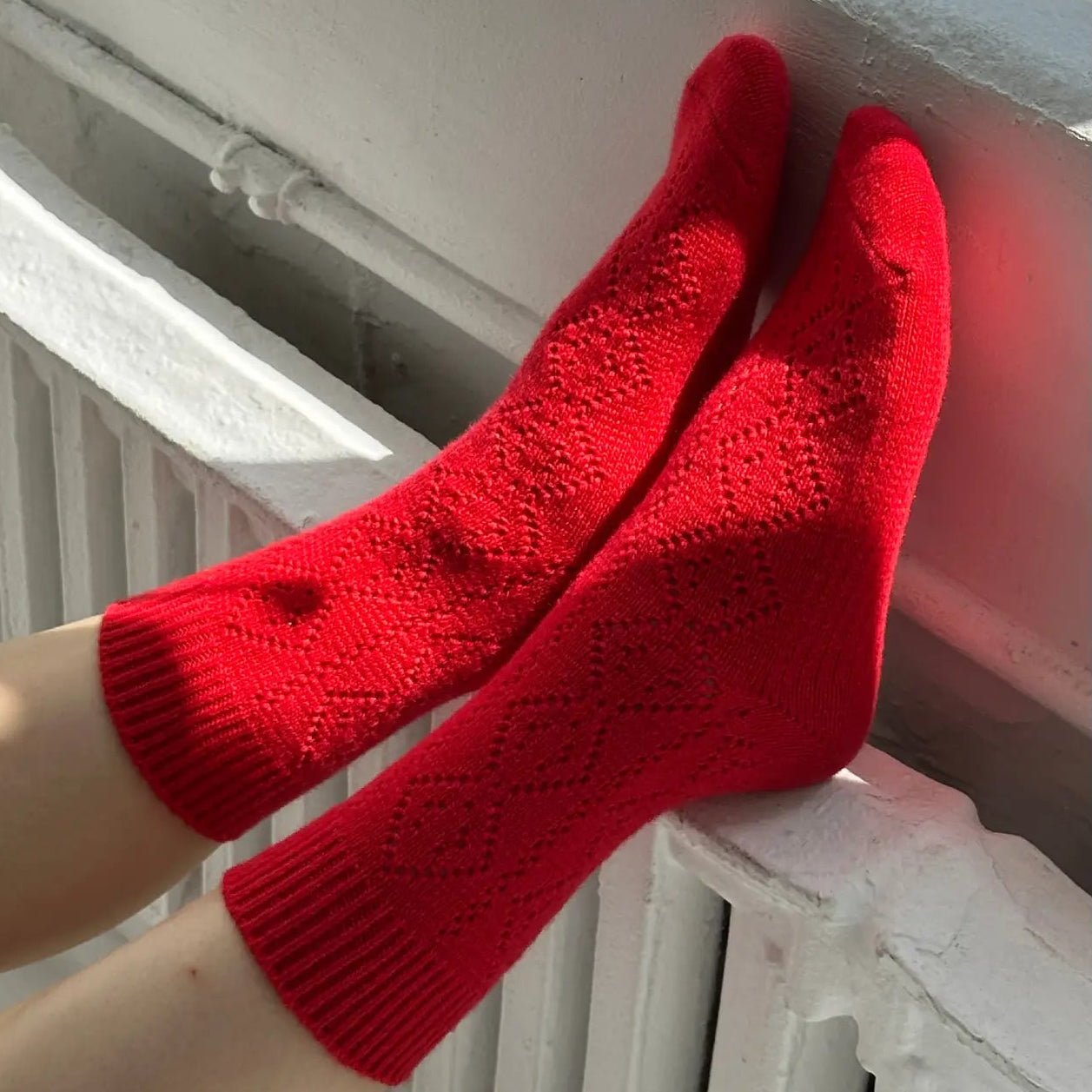 Cozy, soft, and full of charm. A crew-length silhouette with ribbed detail at the top and a delicate pointelle knit that adds just the right amount of sweetness to any look.