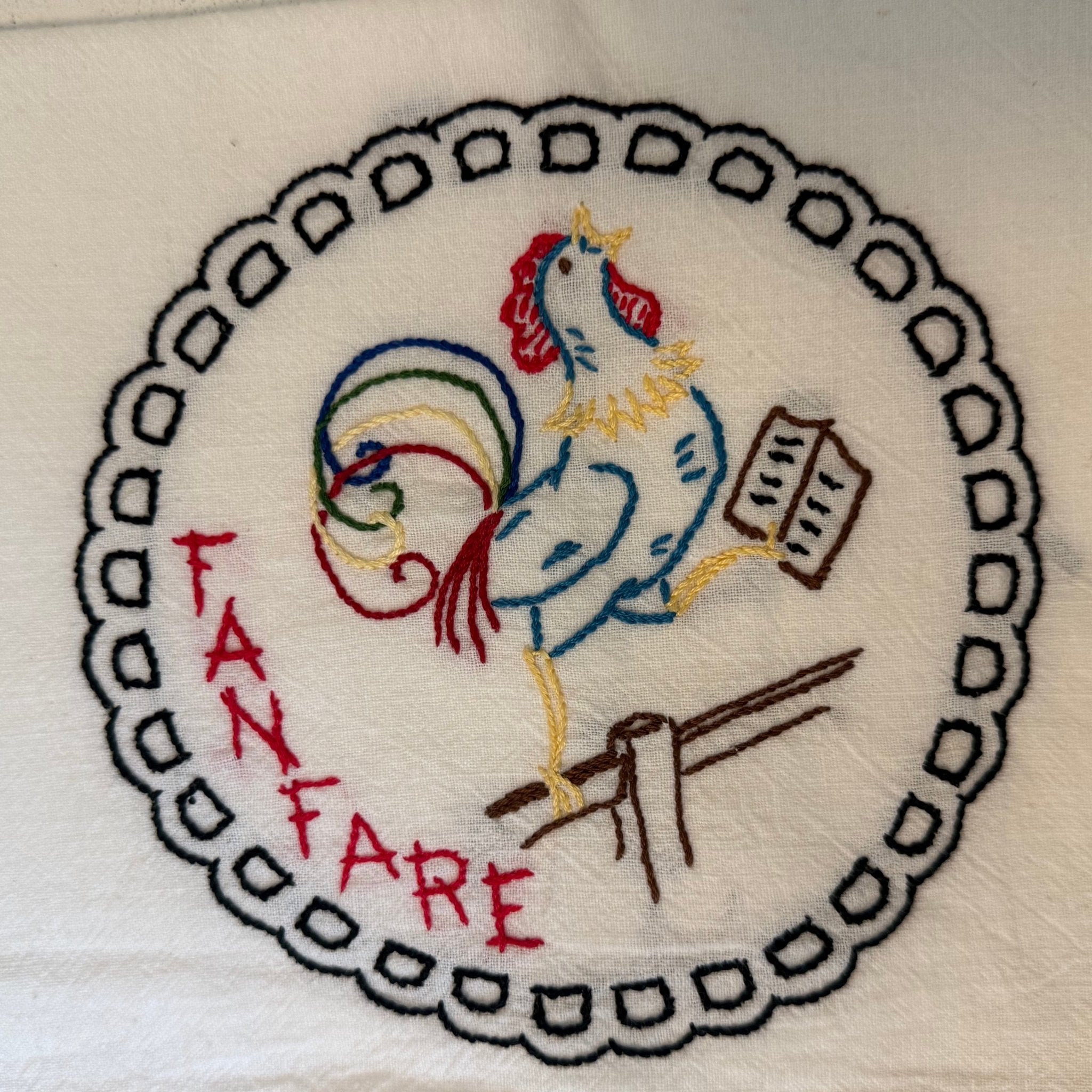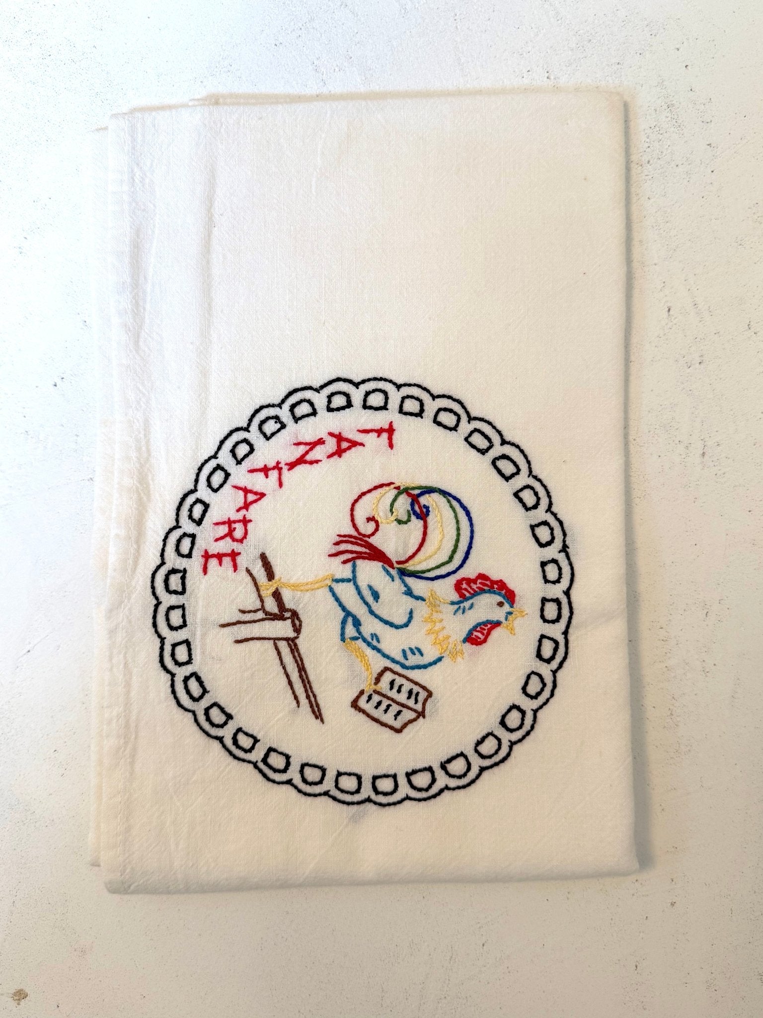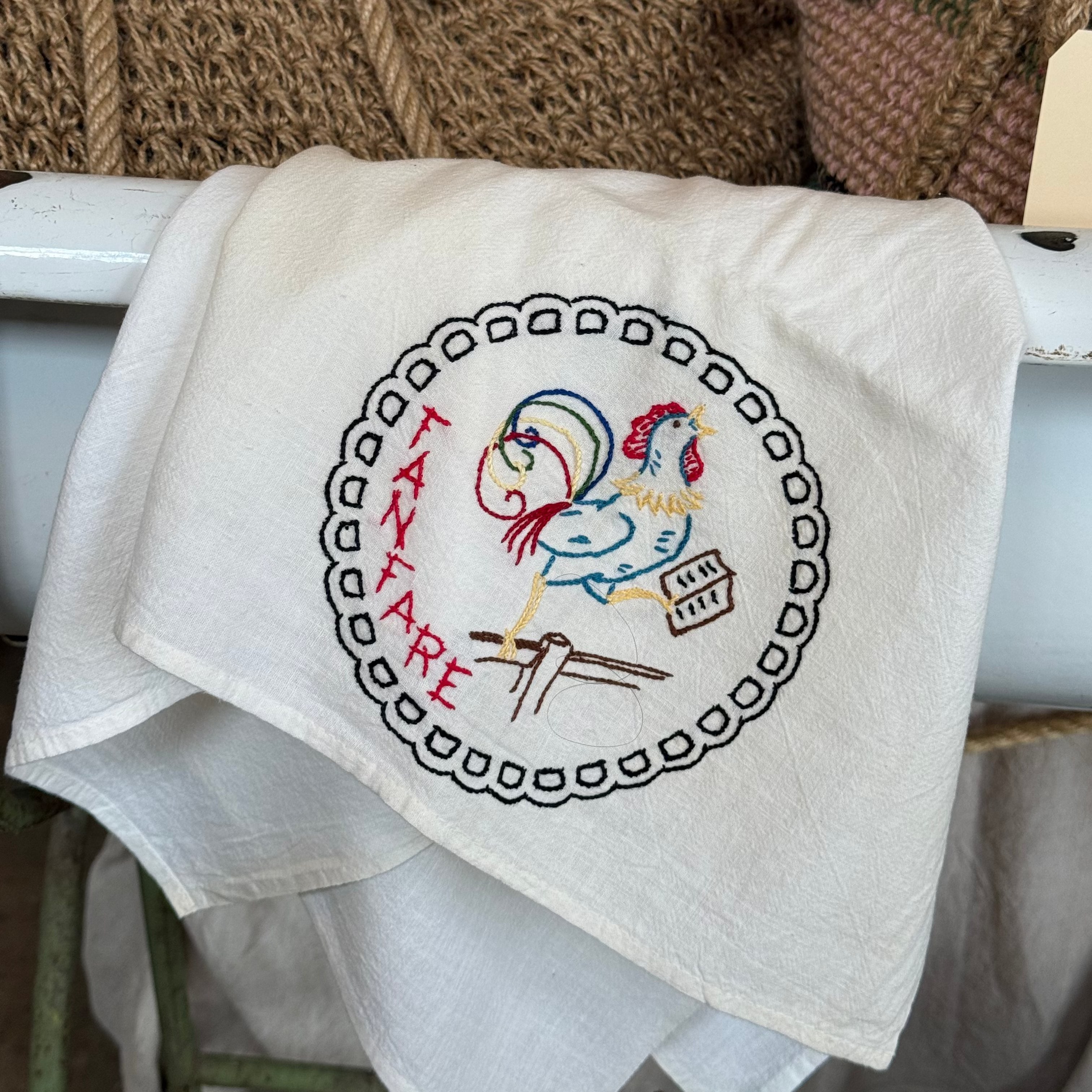 This vintage feedsack embroidered tea towel is a charming piece of farmhouse history. Crafted from repurposed cotton feed sack fabric, it features a delicate hand embroidered rooster that adds character and nostalgic appeal. The soft, durable cotton has a beautifully worn texture, making it both decorative and functional.