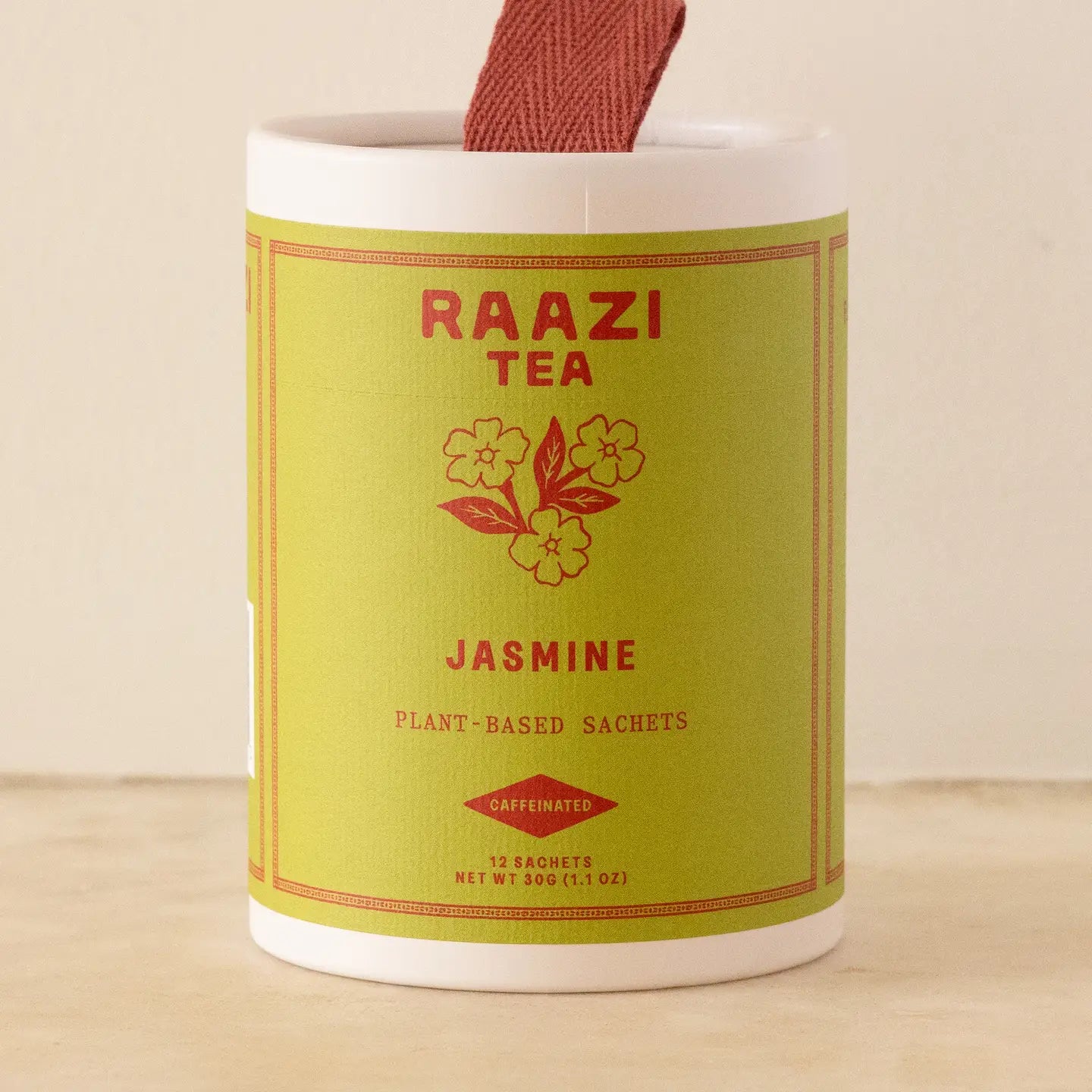 Our floral and vegetal jasmine green tea. This is a caffeinated Chinese green tea scented with jasmine flowers. Each box of Raazi Tea comes with 12 sachets made from a biodegradable, plant-based material, and are packaged into box made from recycled paper. Shelf life of our teas is over a year, and our tea boxes perform great near checkout, as well as in high-end gift baskets.